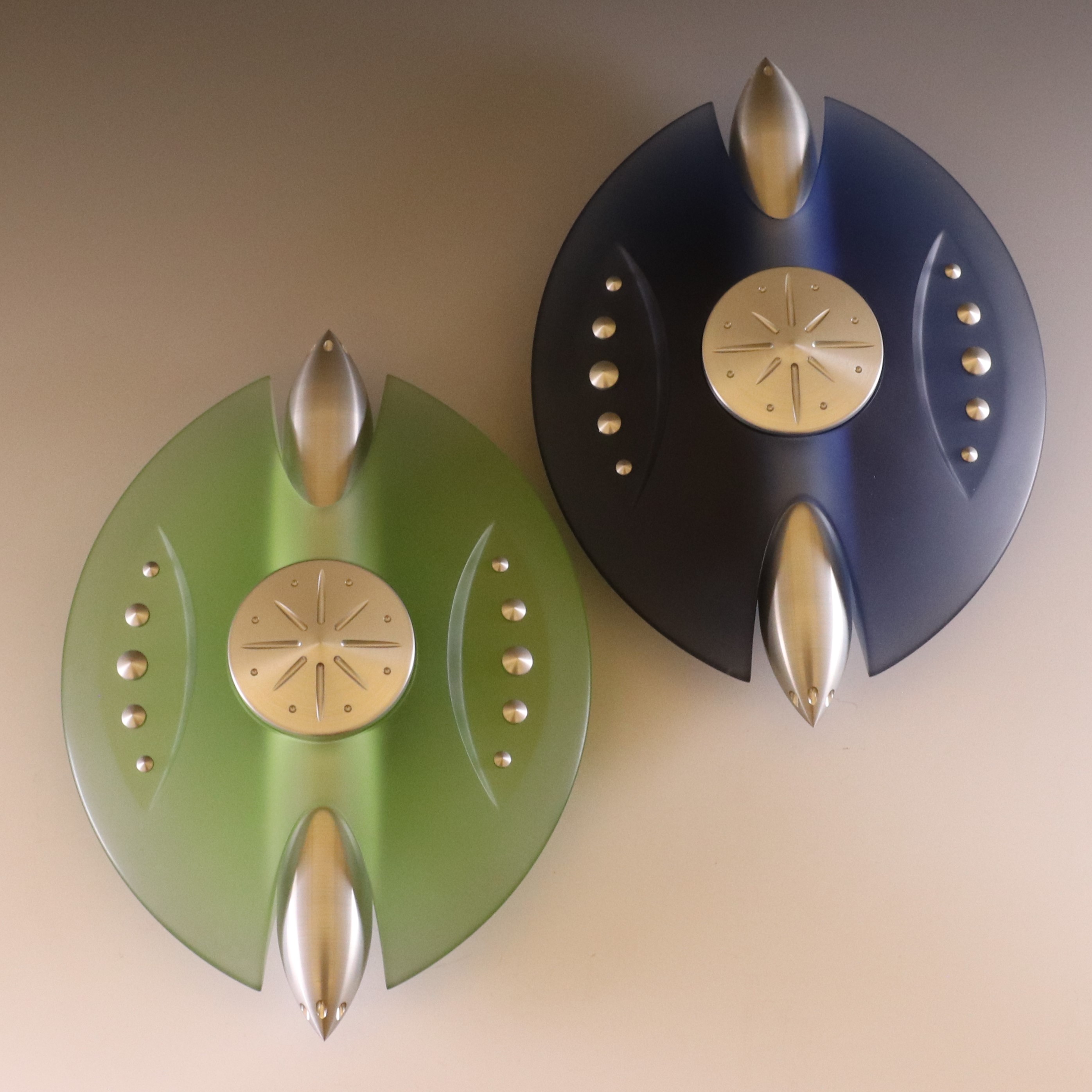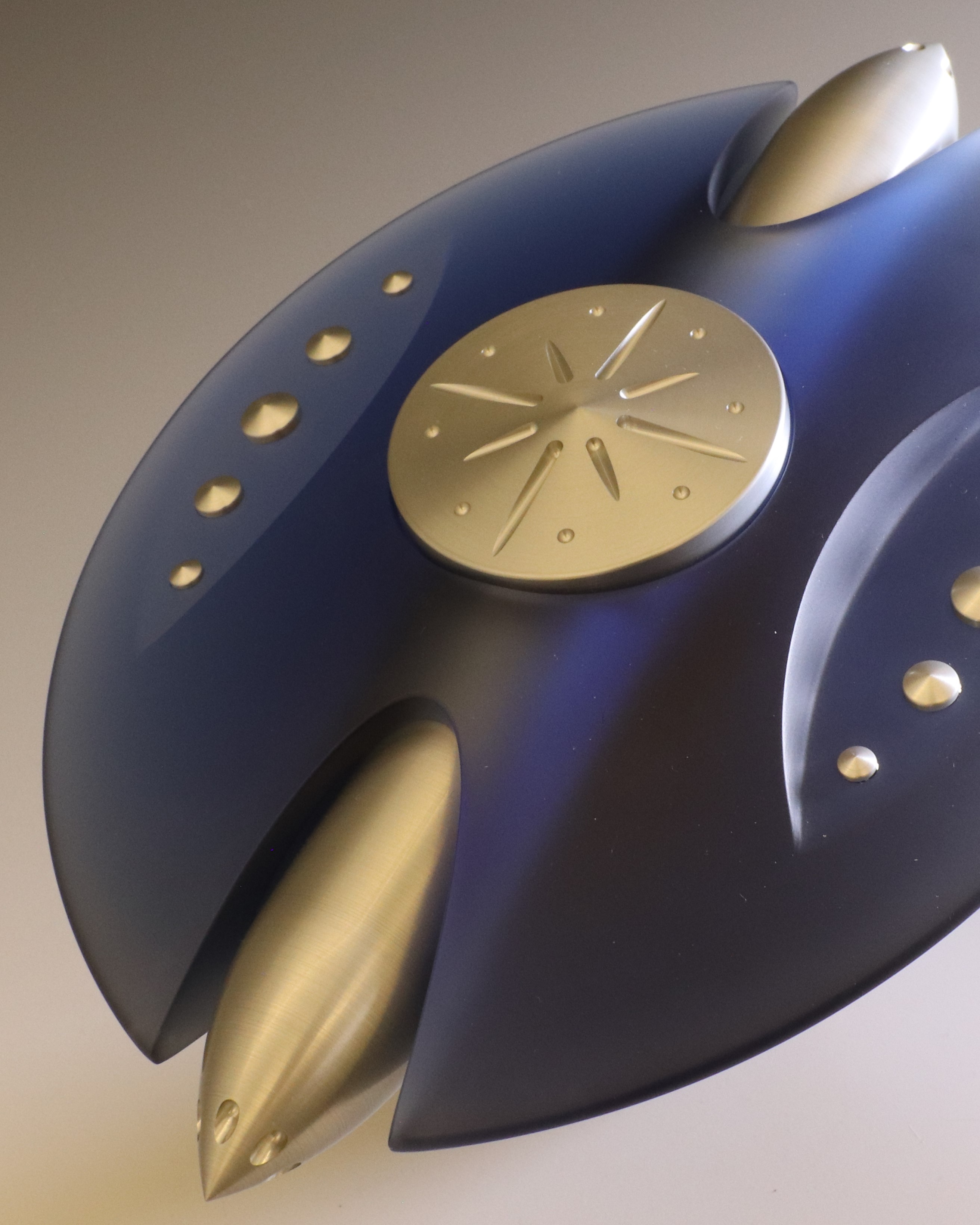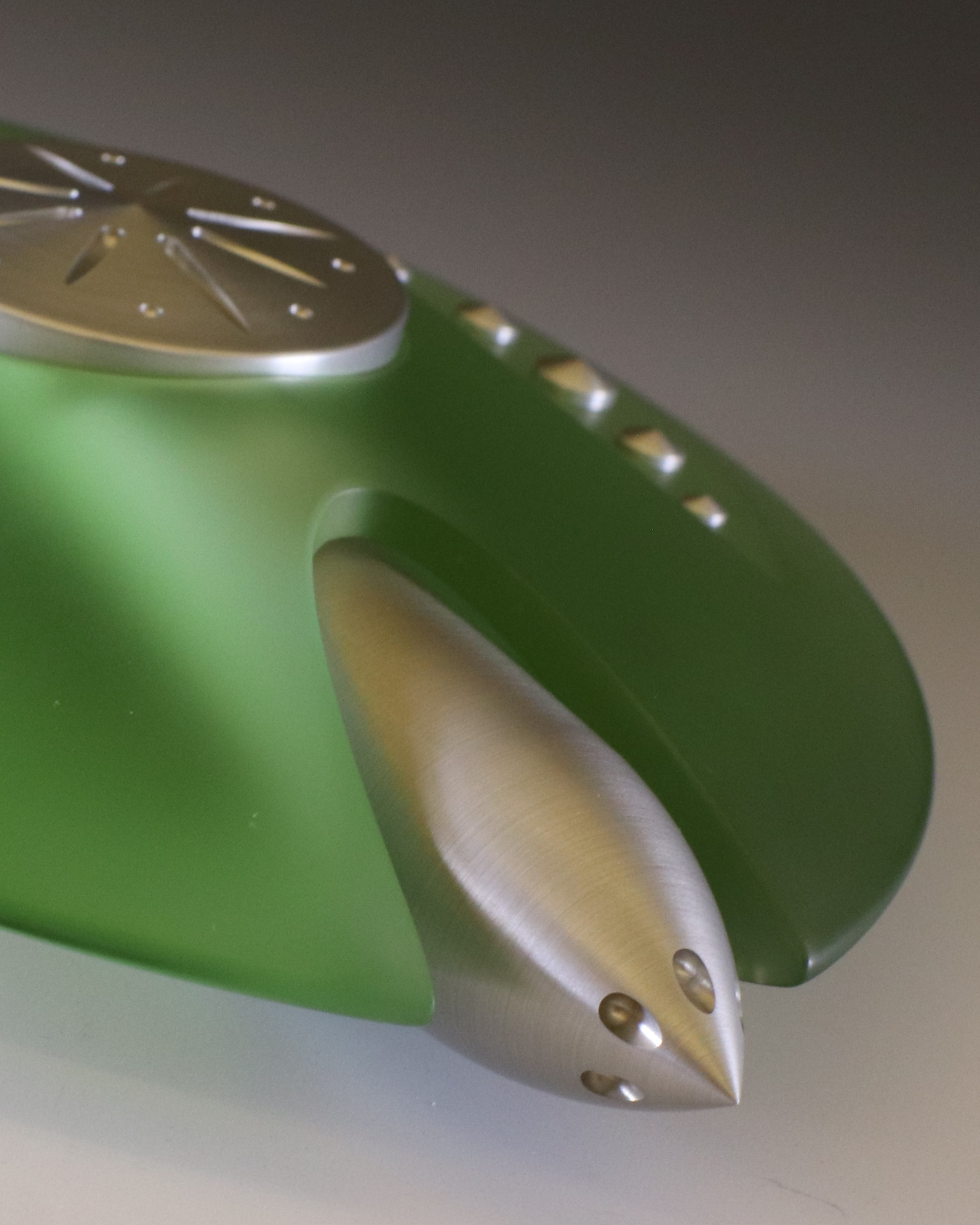 HG-2884 Kiln cast lead crystal & anodized aluminum; assembled. 6cm x 16cm x 23cm. Limited edition, 2-colors.